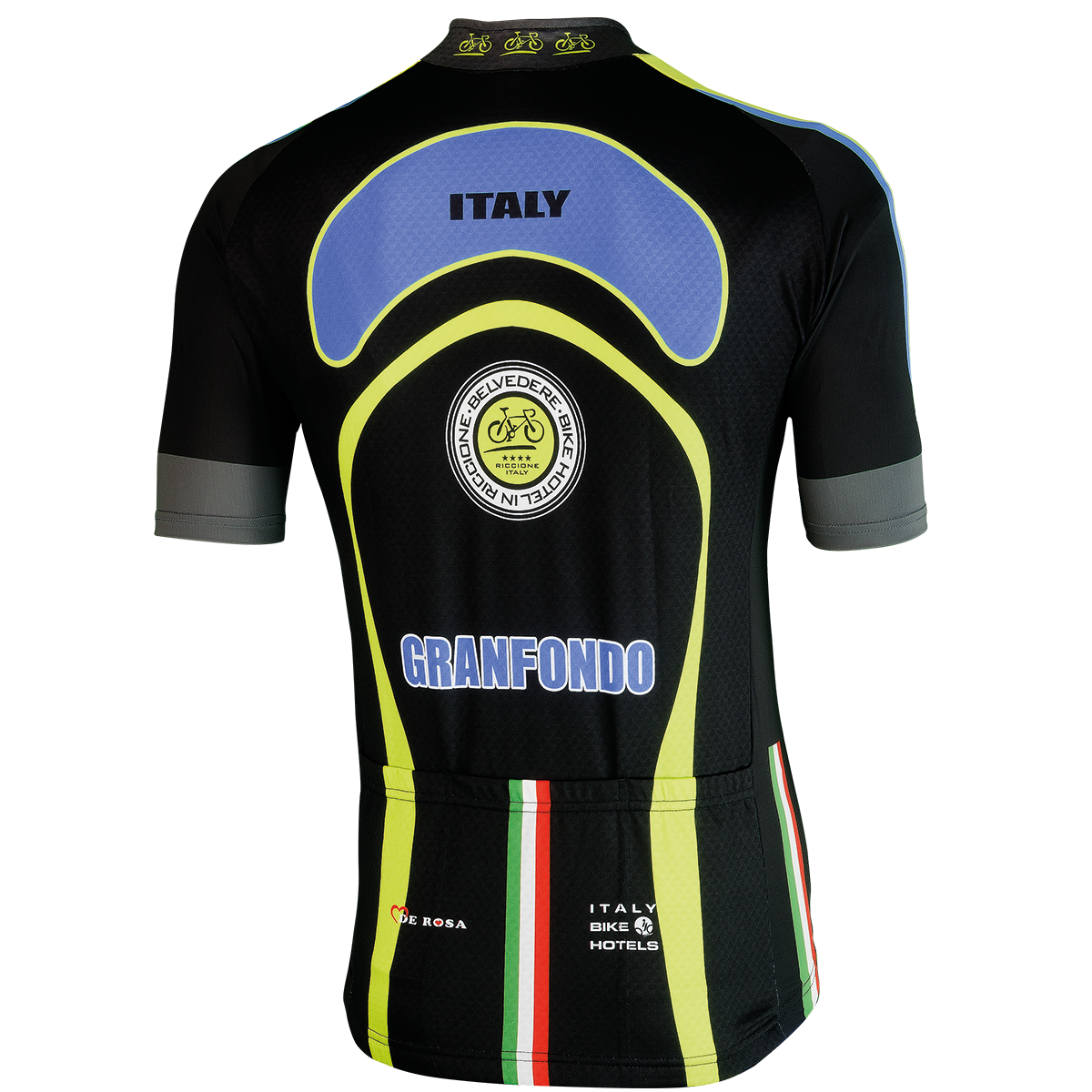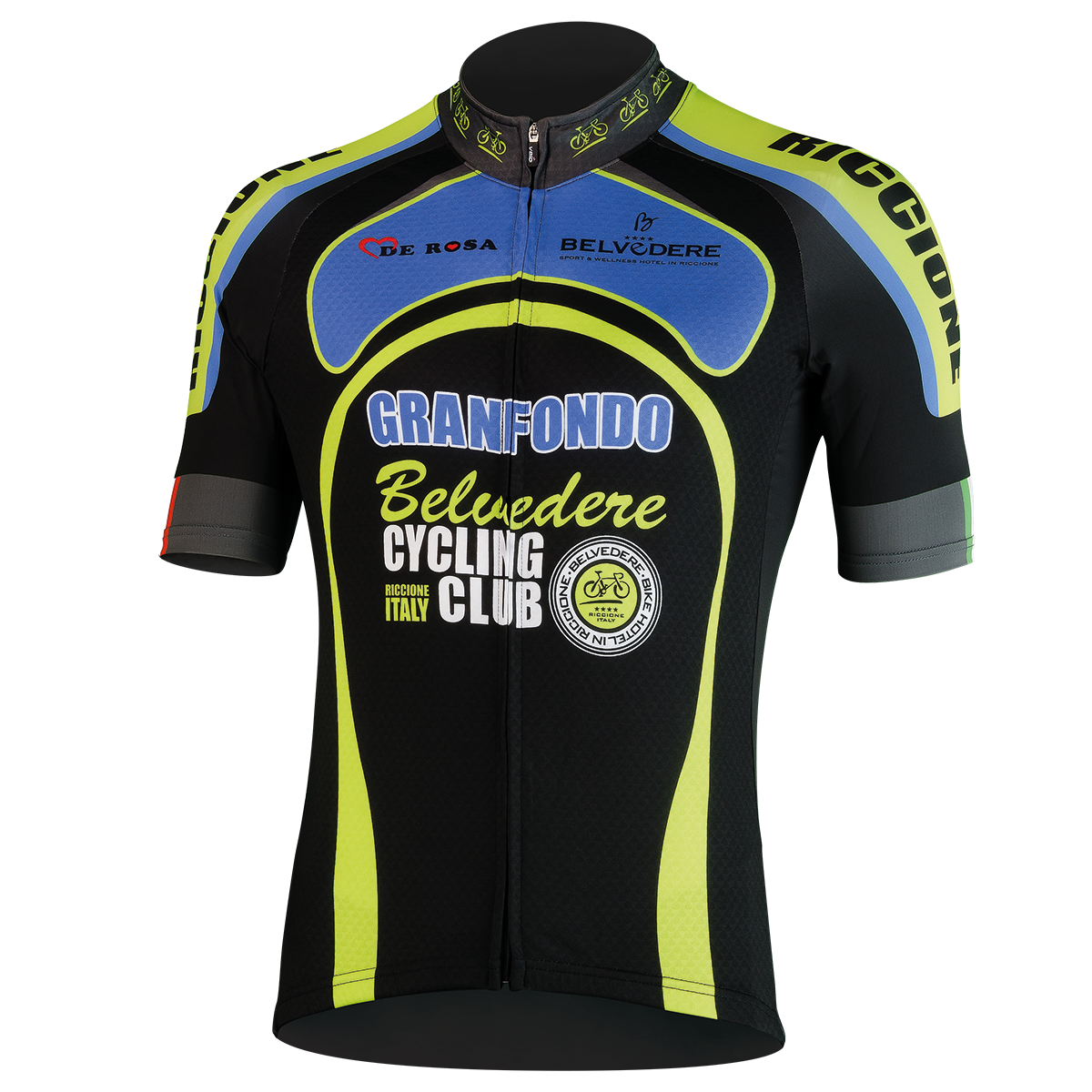 Made in Italy Belvedere Cycling Club Men short sleeved cycle top. Elastic with silicone on sides and back and full covered zip.