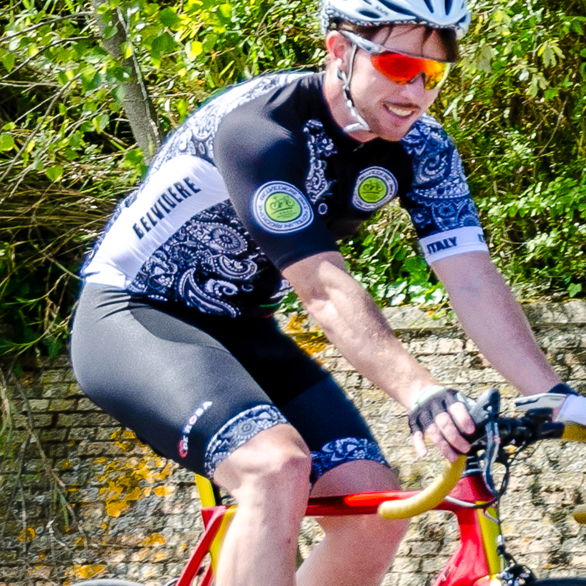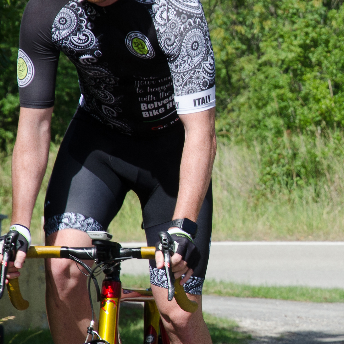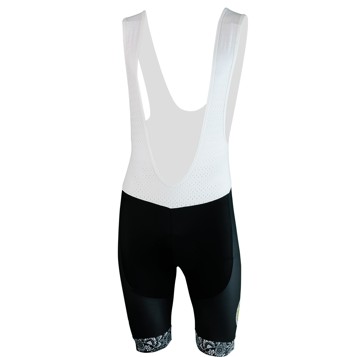 Black Paisley lycra bib shorts. Maximum comfort, lightweight, breathable and stretch. Aerodynamic and great body adherence guaranteeing maximum freedom of movement. Lycra can be stretched to between four and seven times its initial length but returns instantly to its original condition as soon as the tension is released.
