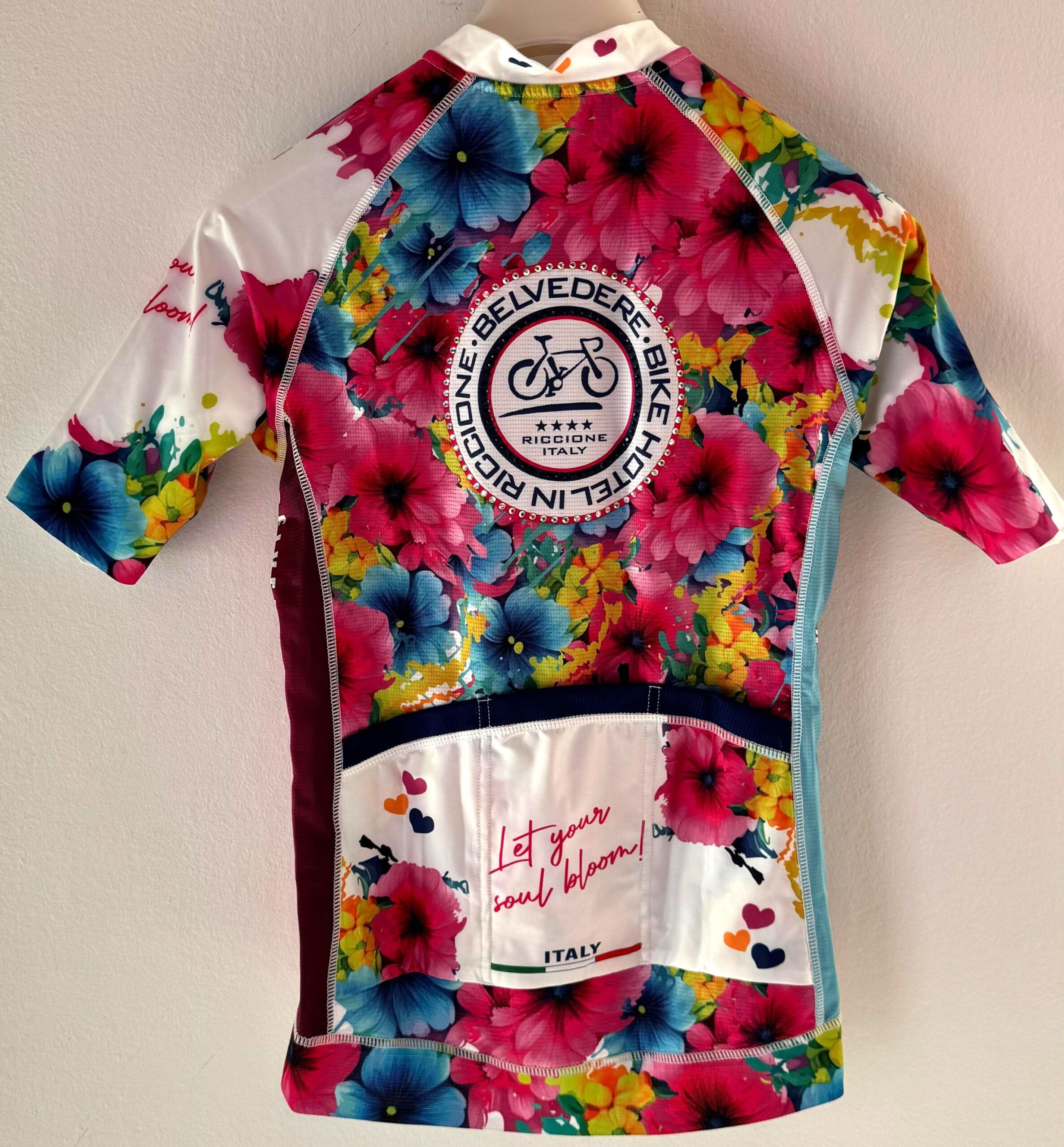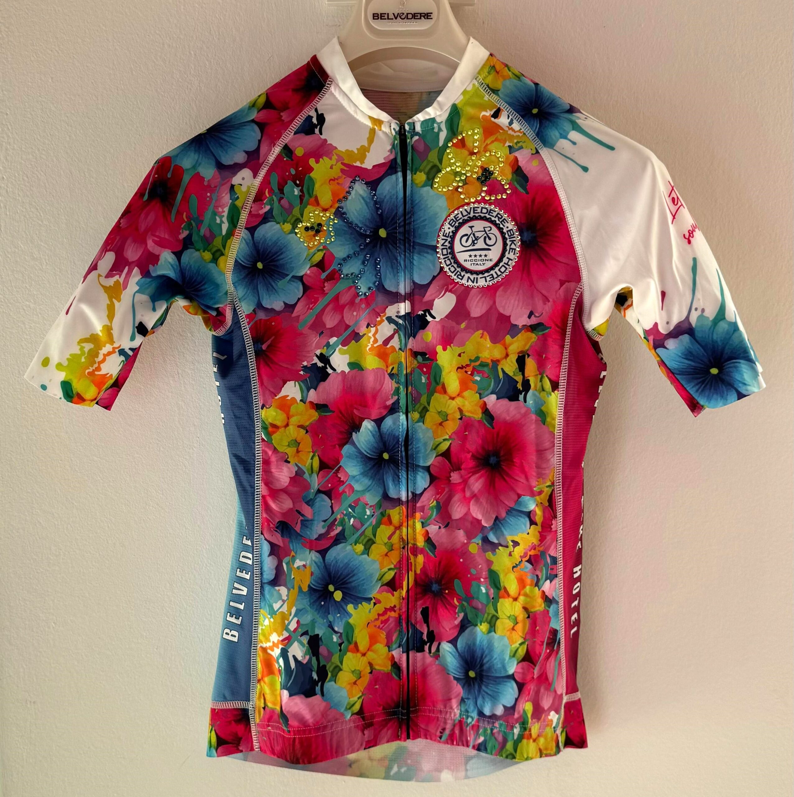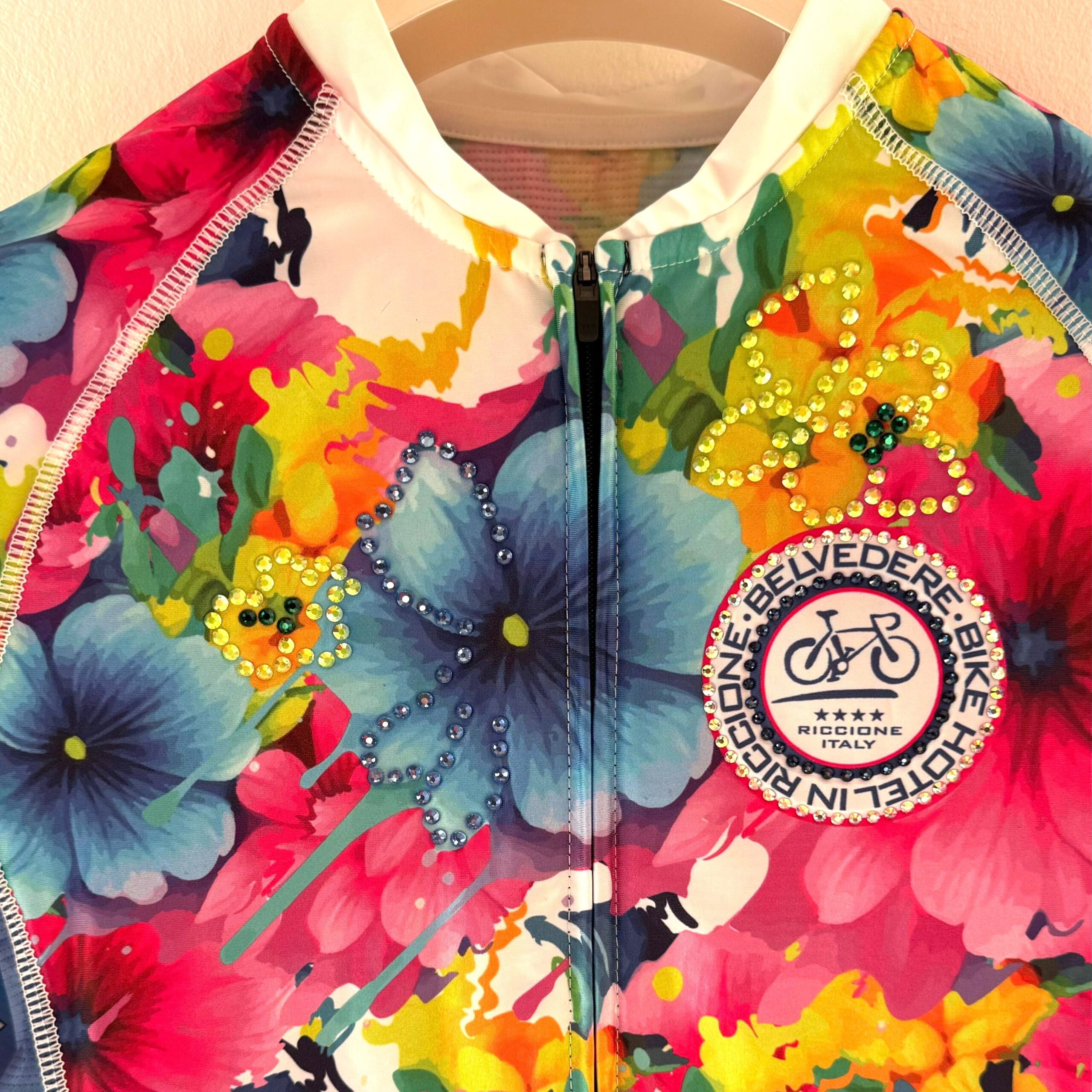 Made in Italy Swarovski short sleeved cycle top with Swarovski and flowers design. Elastic sleeve-end and 3 mesh pockets on the back.