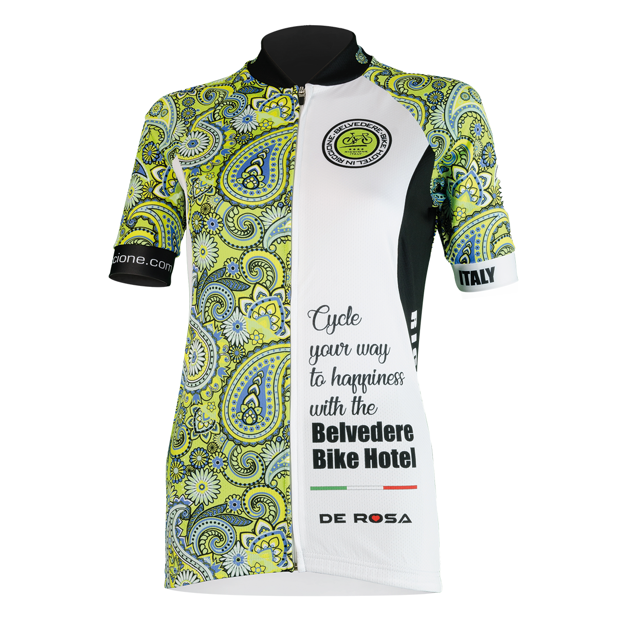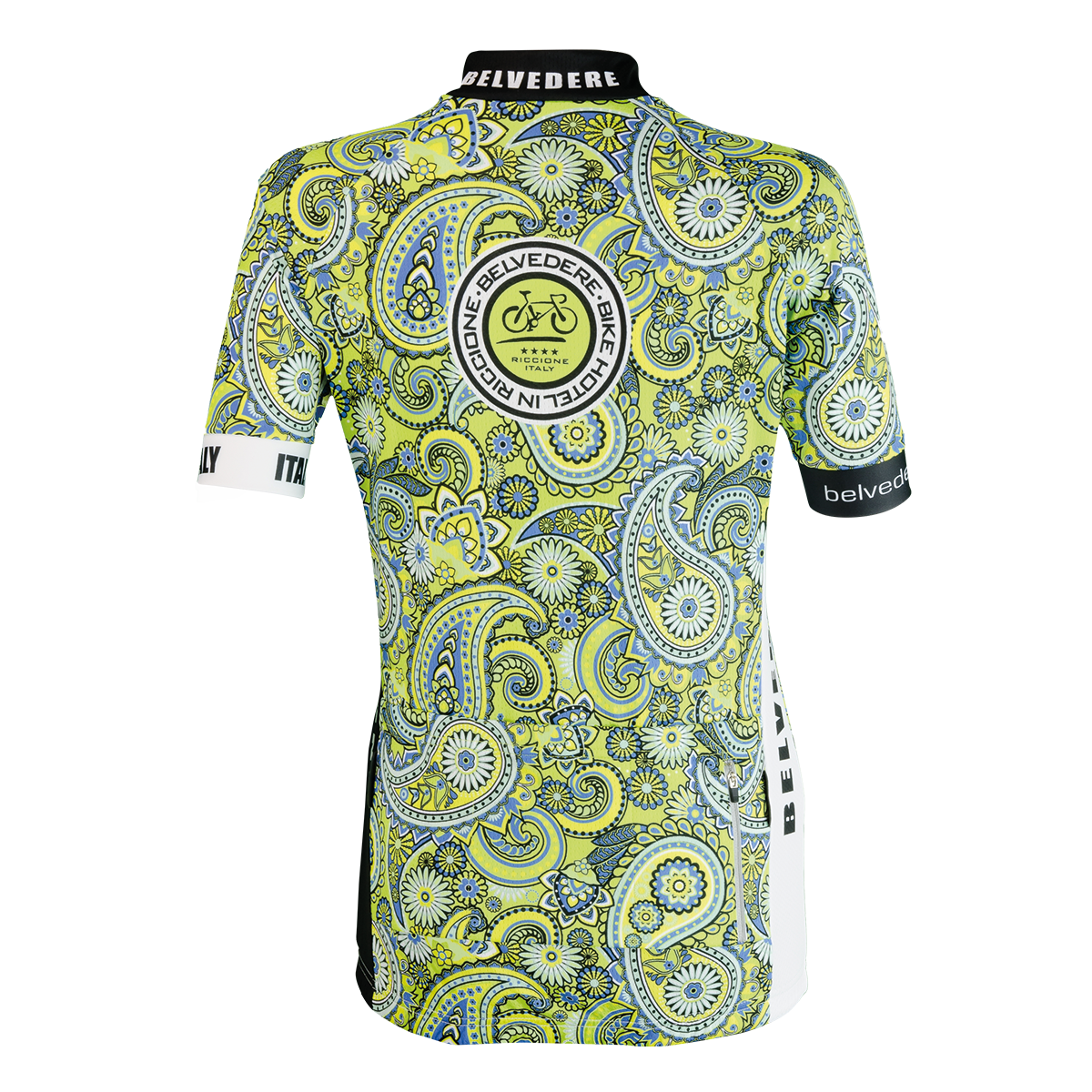 Made in Italy Green Paisley short sleeved cycle top. Elastic waistband with silicone and fourth vertical side-pocket with reflective zip.