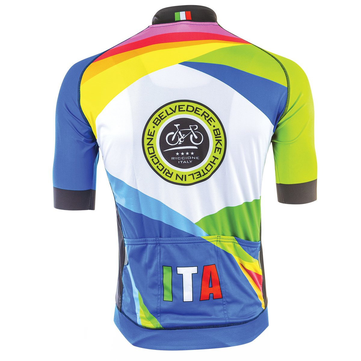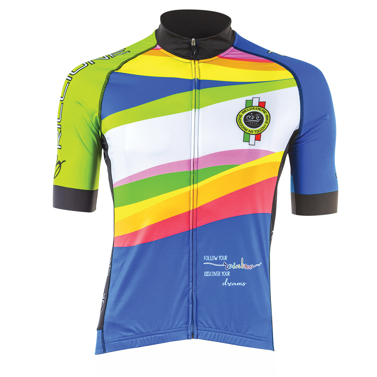 Made in Italy short sleeved cycle top, inspired by the colours of the rainbow. Raw cut sleeves for maximum comfort.